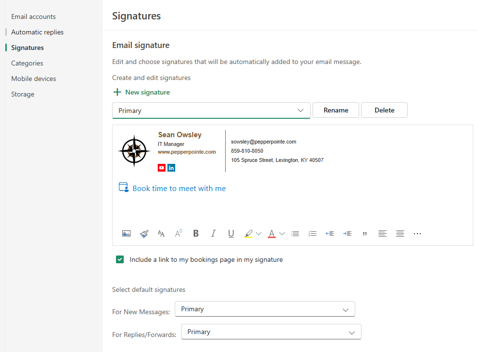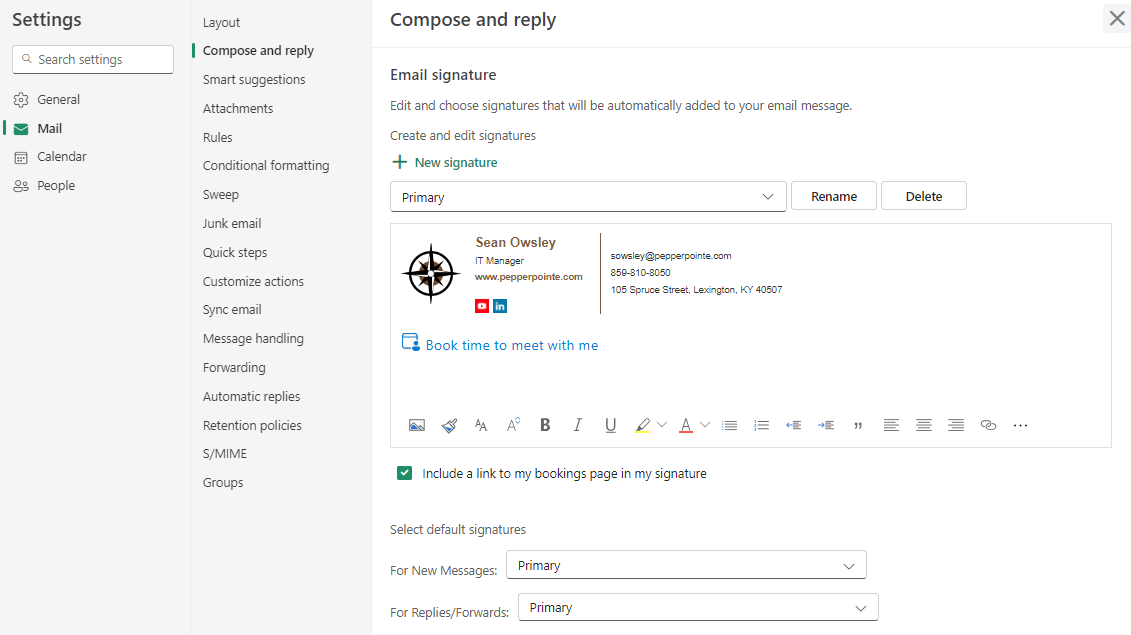 If you want your signature to display at the bottom of all outgoing items, including replies and forwards, select drop down menu beside For New Messages and For Replies/Forwards. If you don’t select this option, you can manually add your signature to any message.