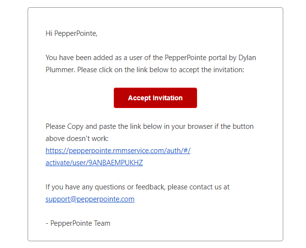 1. Check the inbox of the email you requested for an email from "PepperPointe User Invitation"
