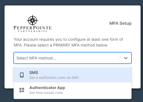 4. Select a 2FA Authentication Method: Authenticator App (Microsoft Authenticator, Google Authenticator), SMS text