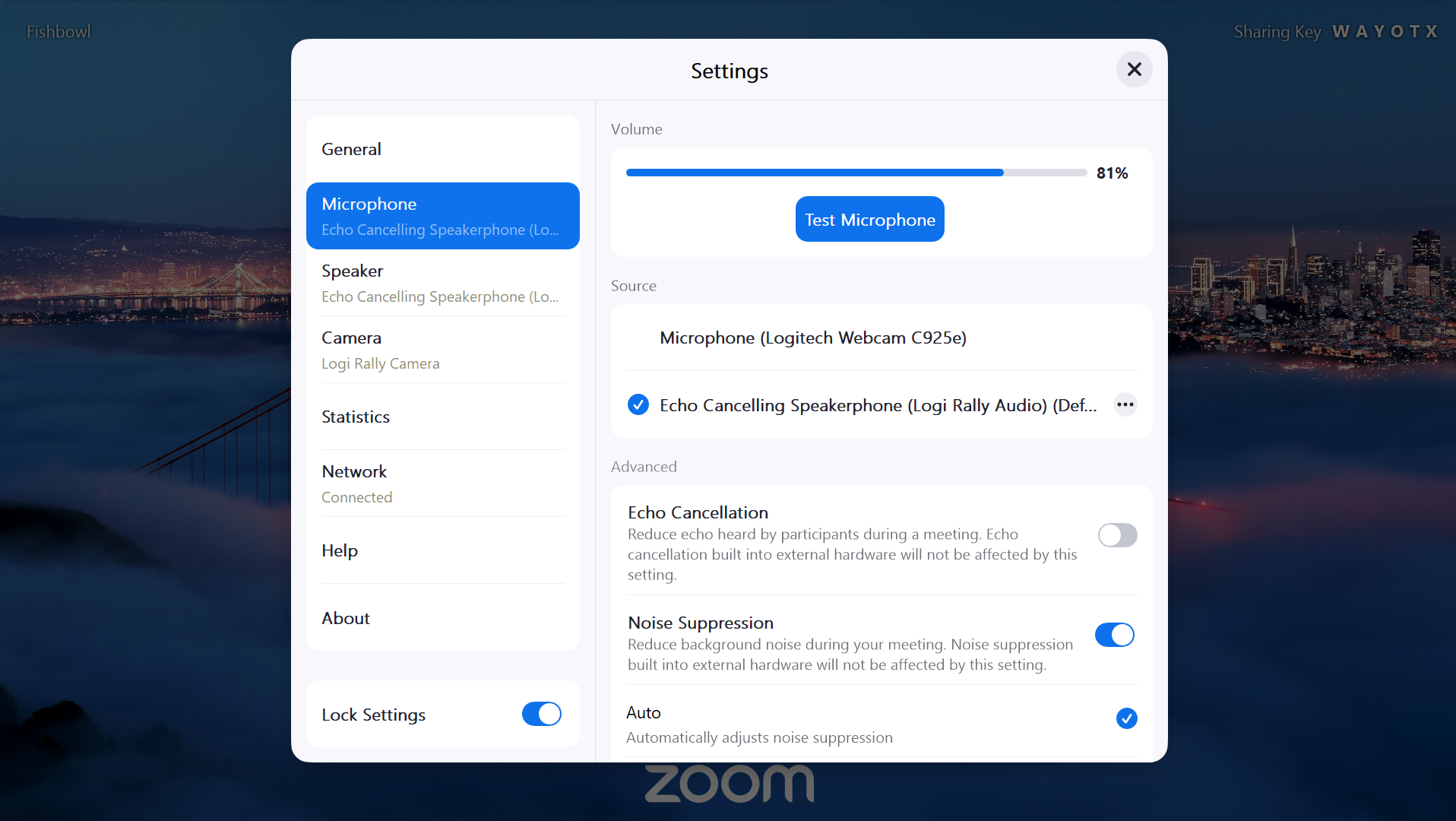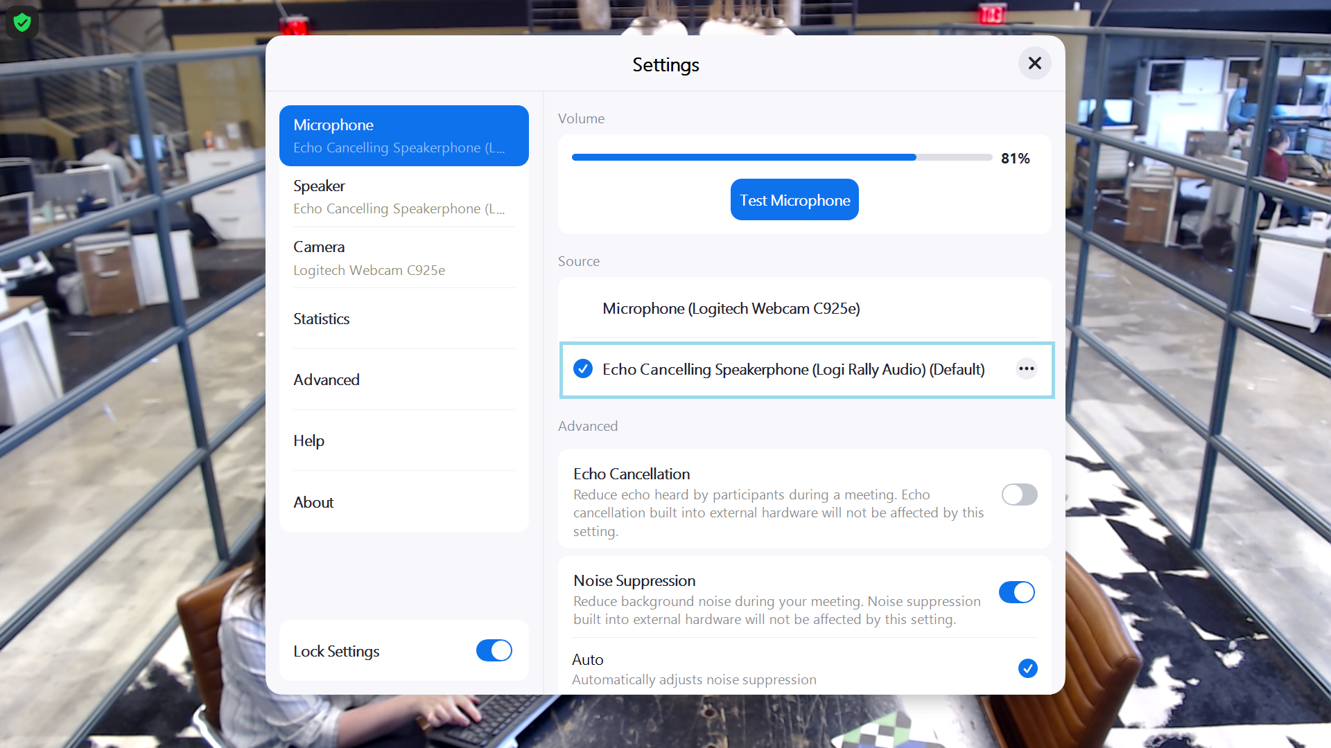 3. In the menu that appears, you can select "Microphone" on the left, then the Logi Rally under "Source."