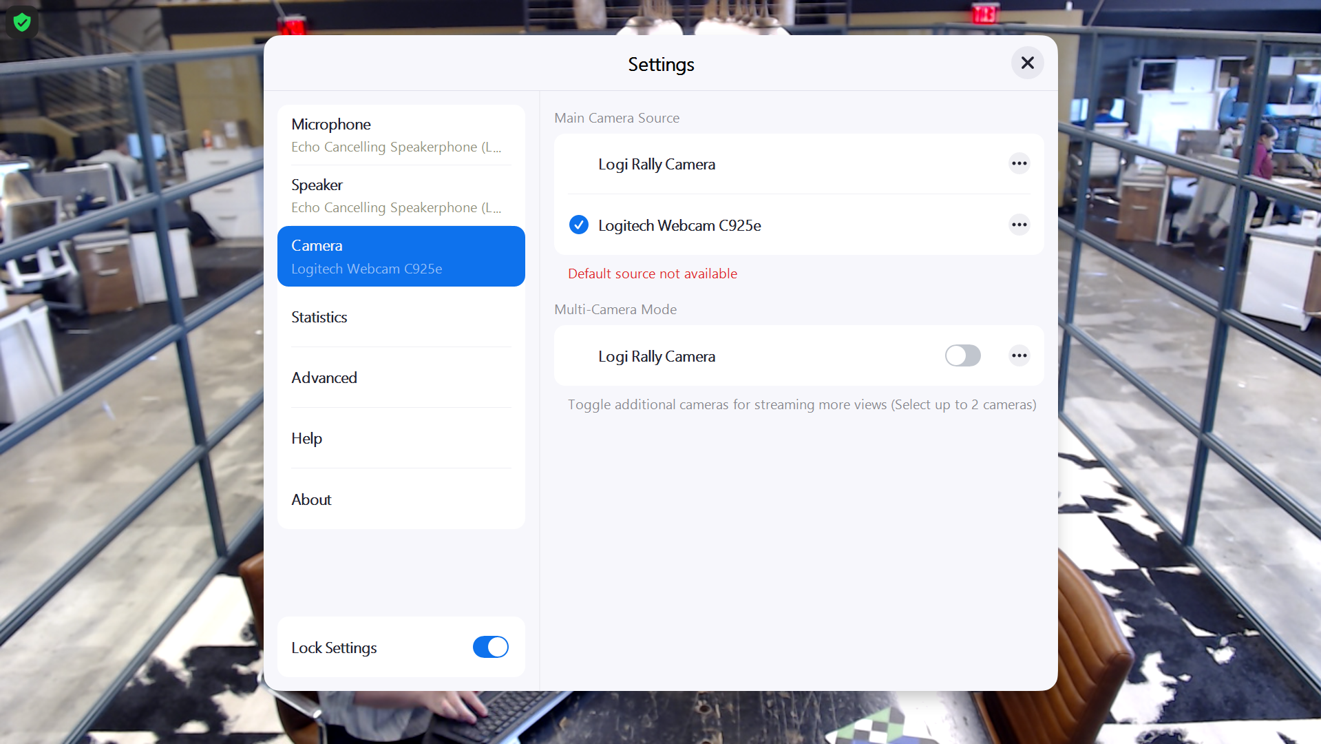 To change the camera, you can click on the video tab, and change the camera from the drop down menu. Logi Rally Camera is the swiveling camera situated on the table, the Logitech Webcam is the camera mounted on the TV.