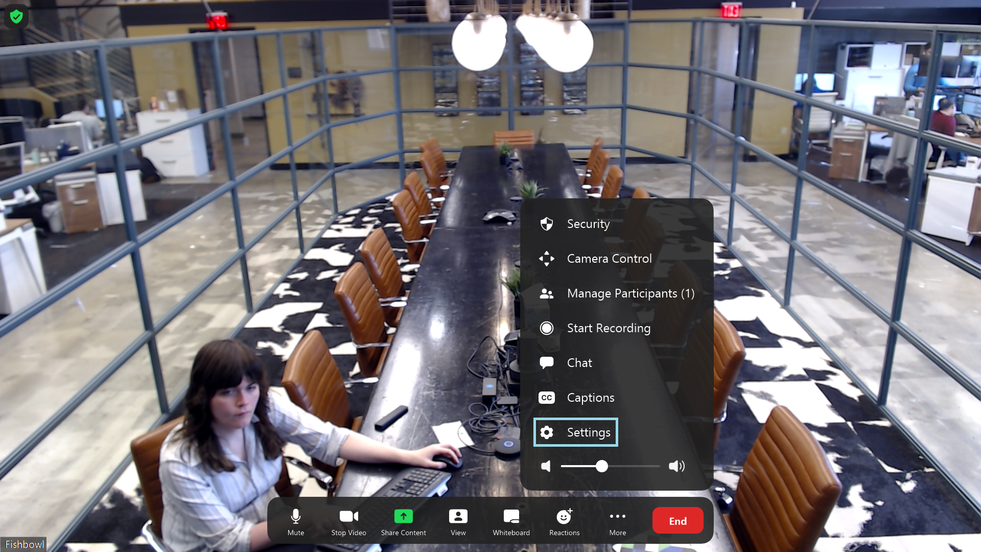 In the Fishbowl conference room, we have two microphones (one of which is the built-in microphone on the webcam, and the other is a high quality noise cancelling mic) and two cameras (the webcam mounted on the TV, and the camera that can be swiveled to face anyone in the room.)