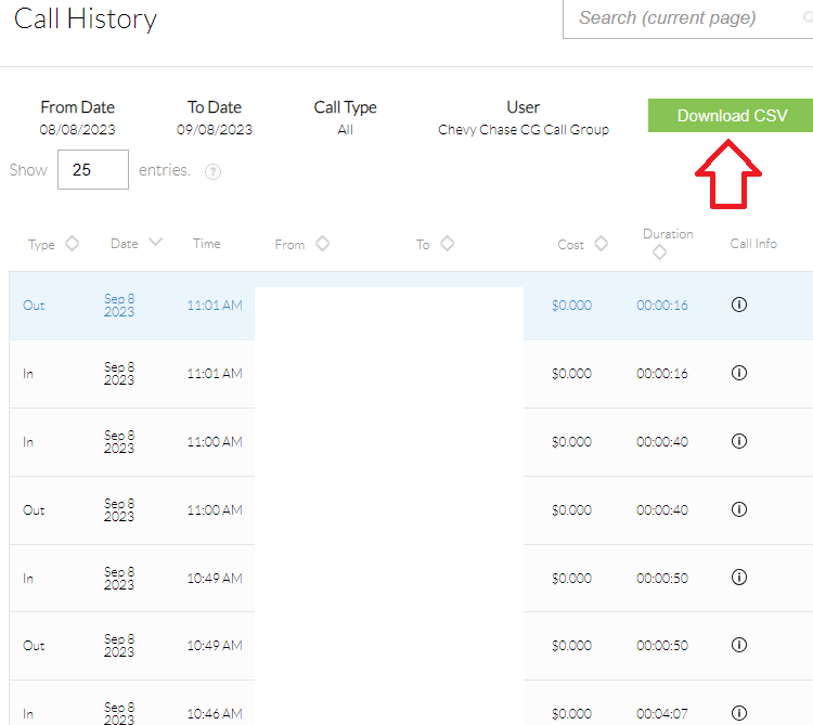 7. You can now view, and search your call logs. To export it as CSV to open in Excel or Google Sheets, click "Download CSV"