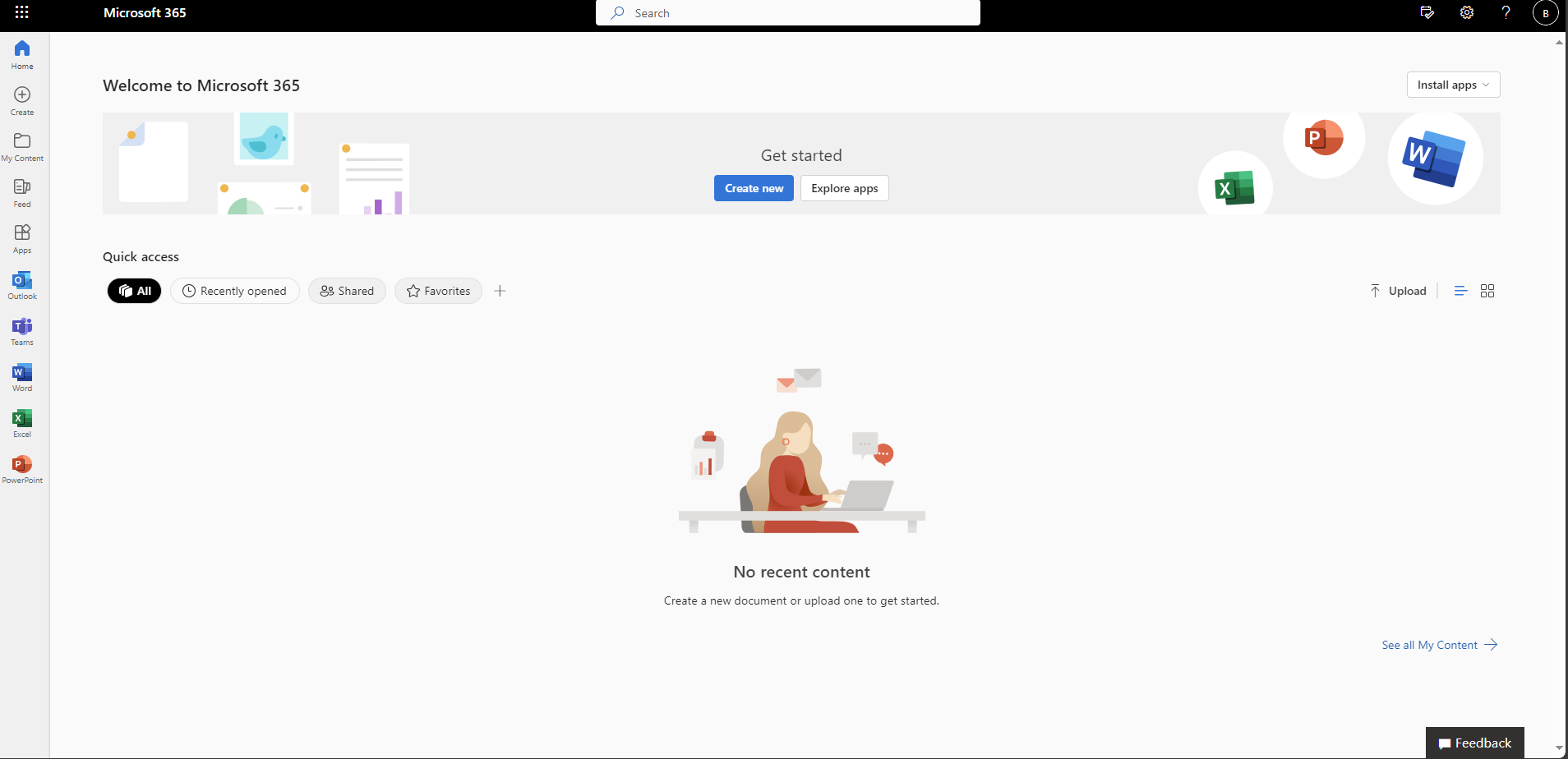 After completing the login in process from https://portal.office.com you’ll be directed to the Welcome to Microsoft 365 screen like the one pictured below.