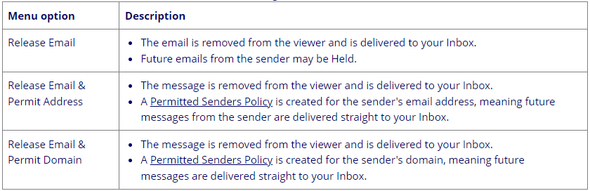 Mimecast applies policies to place email messages “on hold” due to spam, attachment, or content policies, designed to prevent unwanted emails from reaching your inbox. You can view your held emails and decide whether to release or reject them.